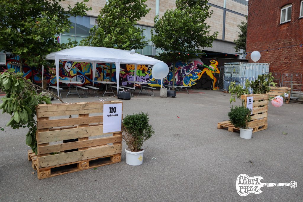 With all the details prepared, after the change of location to the magnificent stage of the Tobakken theater in the Danish town of Esbjerg, the organization arranged chairs for the two hundred attendees to the third edition of Esbjerg Fuzztival. A space with unbeatable facilities with a capacity for 1,400 people (the second largest venue in all of Denmark) prepared with colored balloons to locate attendees according to their origin and maintain that bubble to avoid possible contagion of a virus that has been spoiling the live scene from all over the planet and especially from Europe, The outdoor area also prepared with zones separated by colors so that the staff could safely enjoy their stay at the festival. At the entrance, each attendee was given a bracelet with the color that identified their origin and facilitated their location in those areas. -one for Swedes, one for Germans, and several for danish depending on their area of residence. Everything perfectly prepared for us to feel comfortable and safe despite that certain uncertainty that we all had to see how a festival was going to develop in these atypical conditions. The friendly and tireless team that organized the festival had done everything possible to make anyone feel at home in this oasis of psychedelic doom and underground rock. The first sensations were of surprise and admiration for the unique space and a certain uncertainty about how events were going to unfold. The staff wearing the corresponding mask made contact with the beer stands located in the outdoor area before the start of the concerts.