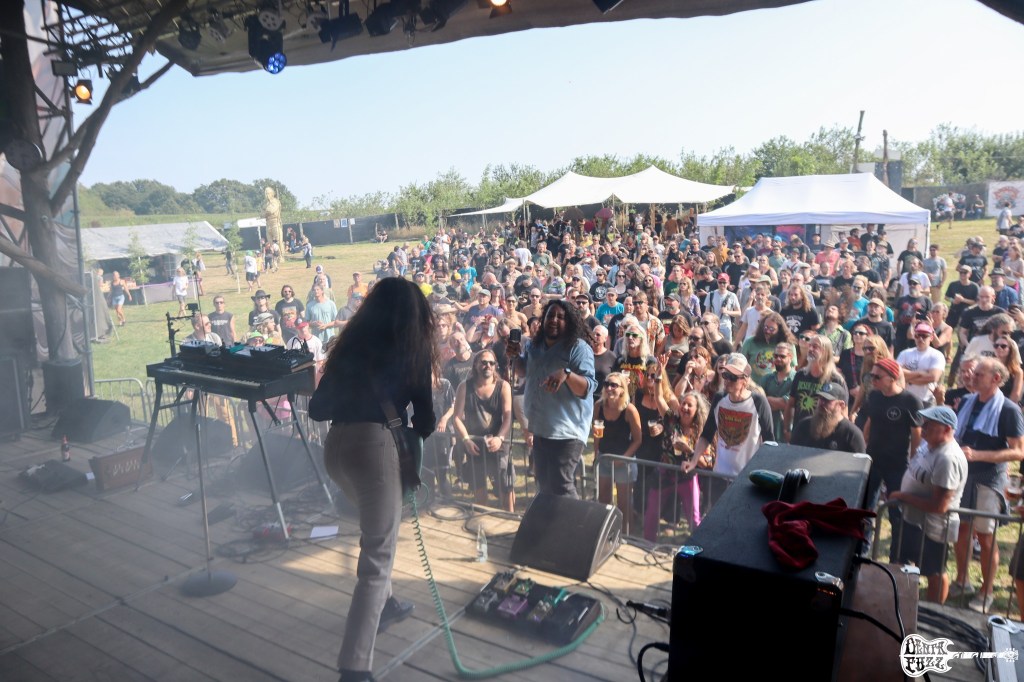 Si el ambiente se había caldeado, con los franceses FUZZY GRASS el ardor del público no tenía vuelta atrás. Una banda joven pero sobradamente preparada continúan labrándose su carrera a base de buenas actuaciones en cada festival que participan, y en esta ocasión, poniendo patas arriba Down the Hill. La fuerza de su cantante, el talento de Laura su guitarra con sus solos asesinos con puro sabor a lo mejor de los 70’s, son un plato gourmet que el público supo degustar, y disfrutar. Todo el personal bailando al ritmo que marcaban los franceses. El heavy blues más auténtico se teñía por momentos de psicodelia chamánica en una actuación para recordar. Algo a lo que deberíamos estar acostumbrados, porque estos chicos, sin armar ruido, saben cómo meterse el público en el bolsillo. ¡¡Inconmensurables!!