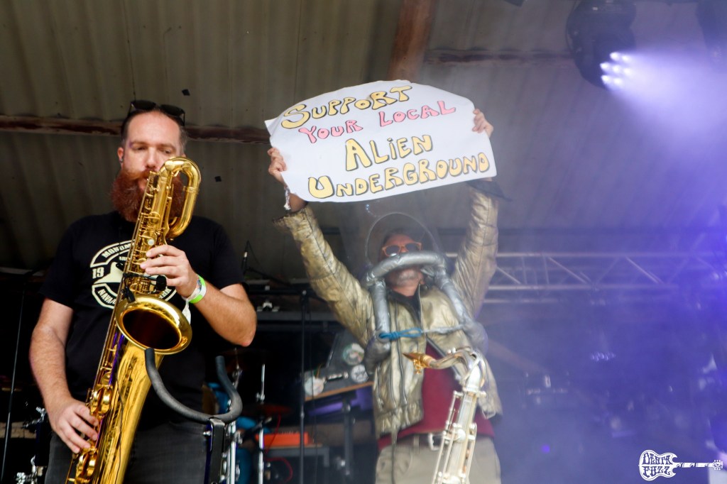 El sábado se despertaba con el sol golpeando sobre un público que poco a poco iba llegando al recinto. Caras de cansancio, pero también muchas ganas de que la fiesta continuará. Habiendo llegado al recinto a una hora temprana, tuve tiempo de ir viendo como el personal de la organización iba tomando posiciones para que todo estuviera perfecto en el momento de la apertura de puertas. Las pocas horas de sueño entre los voluntarios se reflejaba en sus rostros. Alrededor de las doce, KOZMOTROM daban el pistoletazo de la salida al sábado con su psicodelia espacial adornada con los sonidos de viento, alternados con un brillante guitarra. Así con suavidad, iban poco a poco despertando al personal. Una transición suave, con la colorista puesta en escena de su batería. Enfundado en un mono azul de raso ponía el tono bizarro entre pasajes de psicodelia espacial. Frescos y sin estridencias, desgranaban sus canciones ante un público que recibía con agrado la delicadeza del comienzo de la jornada. En su última canción, aparecía sobre el escenario un personaje enfundado en una especie de tubo-escafandra con un cartel pidiendo el apoyo a su alien-underground local. Una apuesta diferente y resultona.