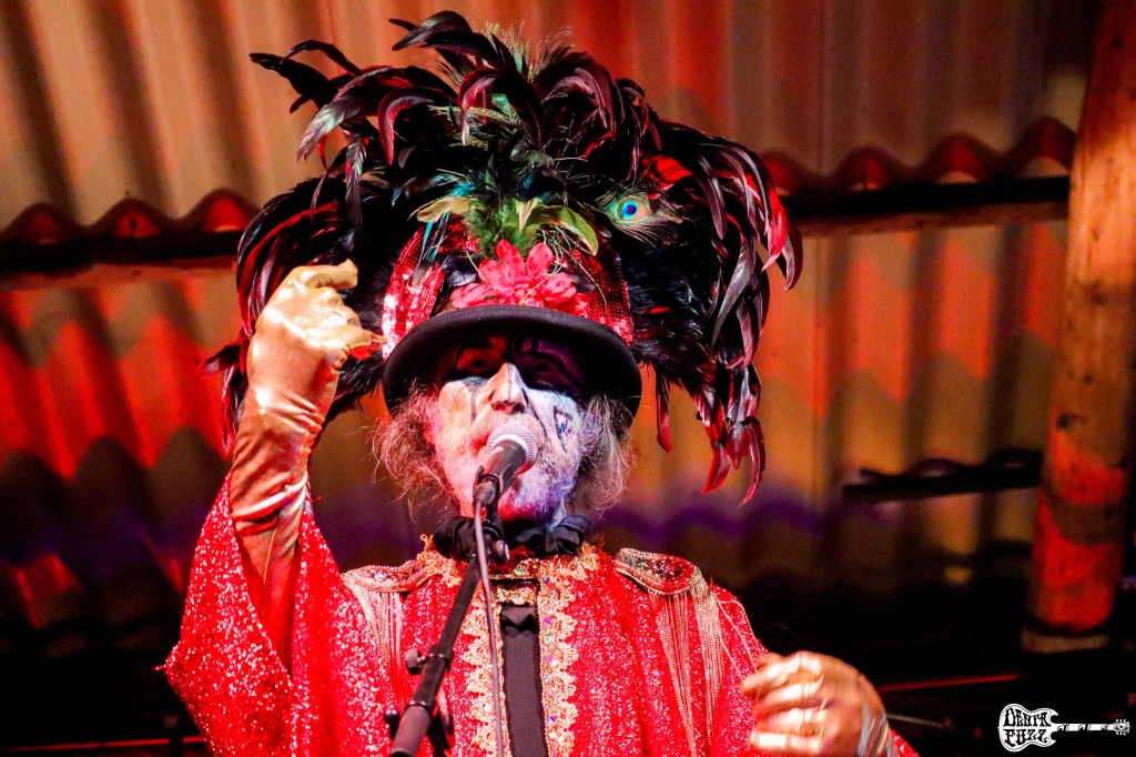 Llegaba la hora de degustar el que para mí, era el plato fuerte del fin de semana, THE CRAZY WORLD OF ARTHUR BROWN . Si ya en Berlín me demostró que un concierto suyo es todo un espectáculo, en DOWN THE HILL, lo corroboró con creces. A priori puede parecer extraño poder ver a alguien que a tocado en grandes eventos junto a lo mas granado de la historia del rock del siempre tocando en un pequeño festival en un escenario construido con troncos en una granja, pero el maestro Arthur es un tipo sencillo, que sabe el terreno que pisa. Desde su llegada al backstage perfectamente maquillado y con su frágil figura repartiendo sonrisas pude notar que la noche sería apoteósica. Con una actitud que muchos envidiarían el octogenario británico supo con meterse al público en el bolsillo con sus locas y divertidas canciones. Con su show perfectamente diseñado, y con dos canciones para atrapar al personal su salida al escenario en la tercera canción con la llama sobre su cabeza, era al aviso de que el fuego de la hoguera rodeada de gente plácidamente sentada se iba a transmutar sobre el escenario en un espectáculo para no olvidar. Con una voz muy por encima de lo podría esperarse de una persona de su edad, y acompañado de unos solventes músicos, conseguía que todo el recinto se convirtiera en una pista de baile. La euforia se desataba en una actuación en la que cambiaba sus disfraces y sus mascaras cada tres canciones. Cada uno de ellos mas sorprendente que el anterior, desde el fuego de su cabeza, hasta el sombrero y maquillaje mas propio de Fredie Kruger, Las máscaras con plumas, los sombreros de flores y sus coloristas túnicas, o el mago sideral con el globo plateado que acabó sobre las cabezas de la audiencia, ponían un espectáculo colorista hecho desde la austeridad. El rock and roll es el rock and roll, y las grandes estrellas conocen el espectáculo, pero también al público, y Arthur entendió esto a la perfección. Su cara y sus comentarios delataban a alguien encantado de tocar en un lugar entrañable y auténtico, como si volviera a sus orígenes. Tras retirarse del escenario volvió para regalar un final de fiesta acorde con una actuación fantástica que siguió incluso después de su habitual baile en circulo junto a su banda. Grandioso como artista, todo un profesional que sabe a la perfección lo que dar al público en sus conciertos, y humilde como persona. ¡¡Bravo!!.