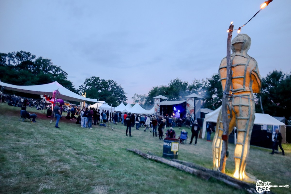 Todavía aturdido por la descomunal actuación de BRIQUEVILLE y con la lluvia complicando jornada, la hoguera empezaba a dar luz y calor a la noche. Sentados en circulo y desafiando al aguacero que por momentos estaba cayendo, el personal se quedaba extasiado ante el poder de las llamas. Las carpas habilitadas se llenaban de gente resguardándose de la lluvia mientras en el segundo escenario DOODSESKADER, el dúo con bajo y batería amenizaba la velada a los más valientes. Una banda con la que no conecté. Sus ruidosas canciones de vocación hardcore se sucedían entre proyecciones psicodélicas.