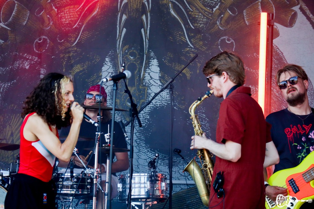 MARY JAME’S SOUNDGARDEN se convirtieron en la gran sorpresa de la tarde. Habíamos comenzado con saxo y este noble instrumento regresaba al escenario. La banda puso sus cartas sobre la mesa. ‘No hacemos stoner’, y tras esa frase los ritmos funky inundaron BLACKDOOR. El colorido bajo amarillo y naranja me hacía prever que nos íbamos a divertir. Con todo el personal bailando la banda pone la nota colorista por la vía del soul y el funk. Pero su talento no impedía a su guitarrista emular a David Gilmour con solos imponentes y rebosantes de magia. Ellos pusieron la fiesta en un territorio que no es el suyo. A destacar una cantante simpática y danzarina que sabía como meterse al personal en el bolsillo.