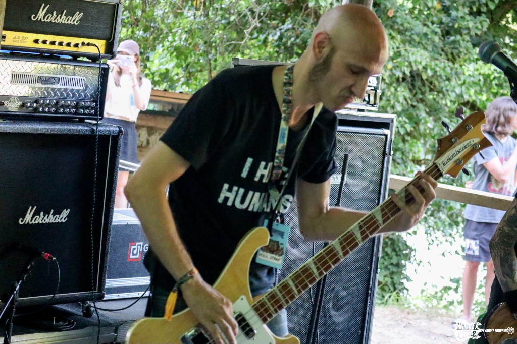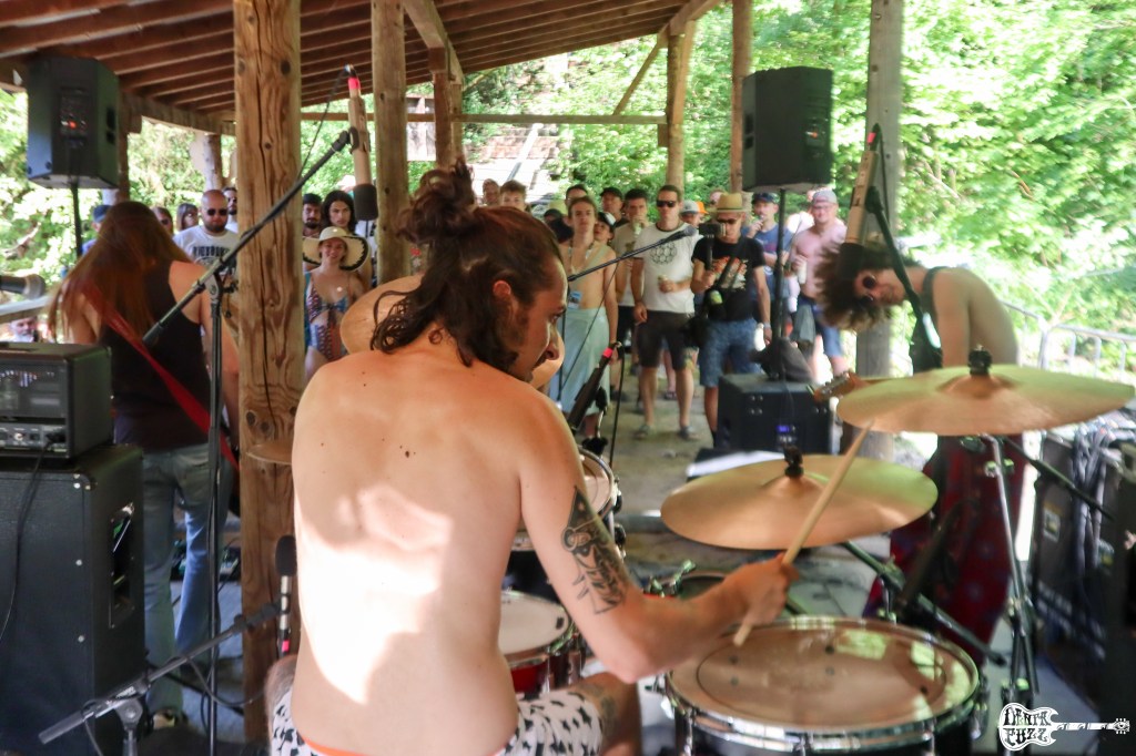 Con un sol de justicia los visitantes de Bear Stone iban despertando con caras de cansancio tras los excesos de la noche anterior. Con los puestos habilitados para el desayuno recibiendo al personal, la mañana fluía con calma. La zona de baño iba recibiendo cada vez más gente equipada con tablas, colchonetas, etc.. haciendo que la espera hasta el comienzo de los conciertos se hiciera más llevadera. La organización me comentaba un cambio en el orden de las bandas por el retraso del vuelo de Monolord desde Suecia, haciendo que el programa variará adelantando la actuación de Graveyard. Con ellos estuve charlando y estaban sorprendidos por el entorno natural en el que se hace el festival. En ese momento aparecieron las chicas de MaidaVale, con las que he estado en numerosos conciertos y al igual que Graveyard, sus caras de sorpresa por la belleza natural se repetían. Me transmitían el temor por si hubiera animales peligrosos en la zona, algo que generó unas risas. Venían hambrientas y las dejé en su intimidad y me dirigí al Mill stage donde ATOMIC MOLD acababan de iniciar su concierto. Con un público reducido en esa temprana hora en la que la climatología invitaba a darse un baño, sus condicionales comenzaban el headbanging al ritmo lento de su Stoner doom humeante. Tras verles varias canciones me retire a comer algo antes de que se iniciará la jornada de bandas en el jam stage.